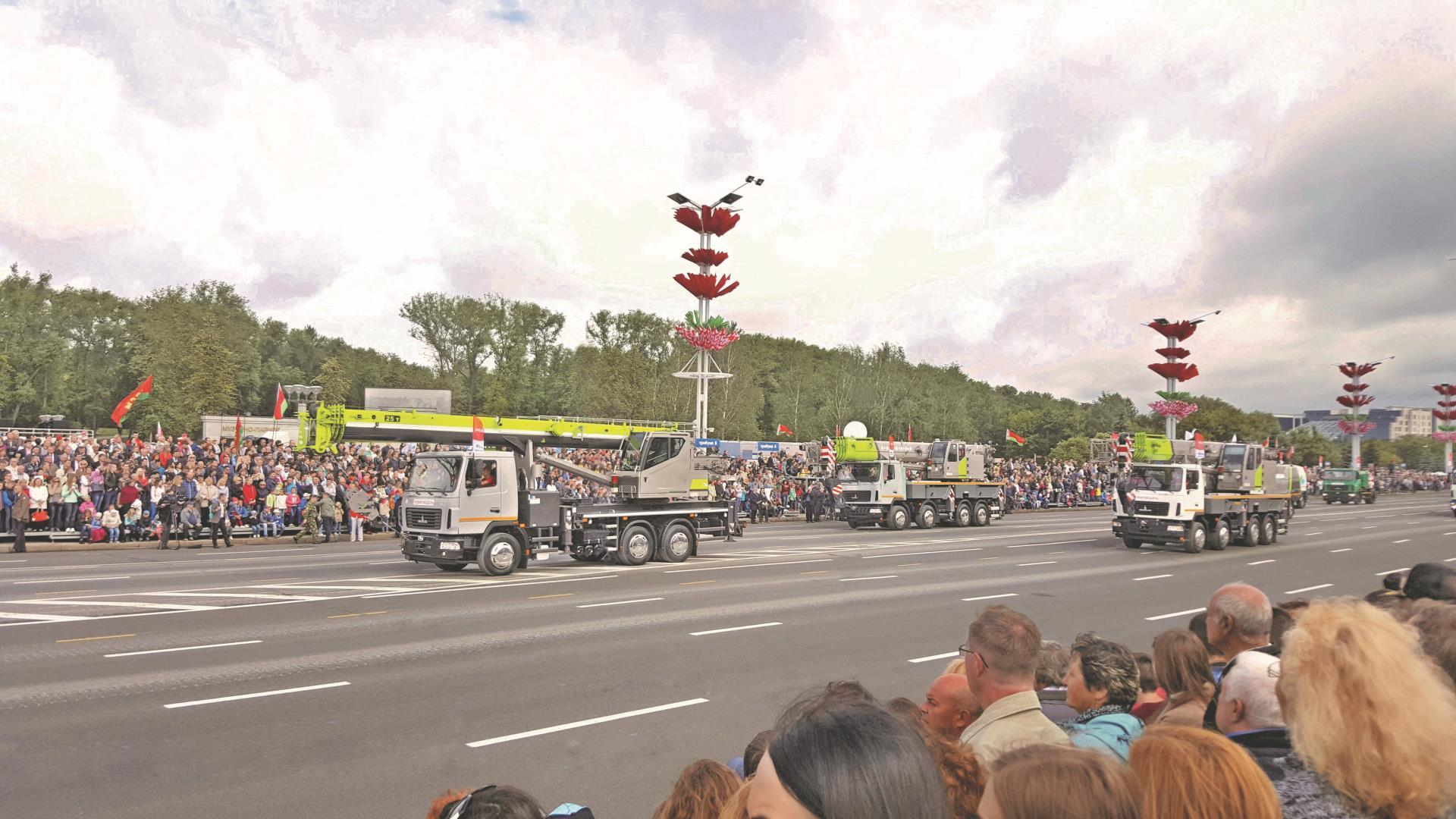 在民用车辆方队中,4台身披绿灰涂装的产品格外引人瞩目,据了解,这是由来自国内装备制造企业中联重科与白俄罗斯著名企业MAZ集团合作生产的4台高端装备组成的仪式方队。它们接受了白俄罗斯总统卢卡申科的现场检阅。
